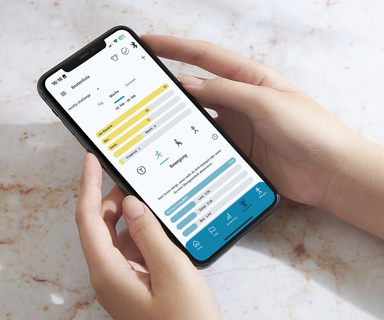 Strong together! The rectify app's leaderboards and challenges turn posture improvement into an interactive experience and provide additional motivation.